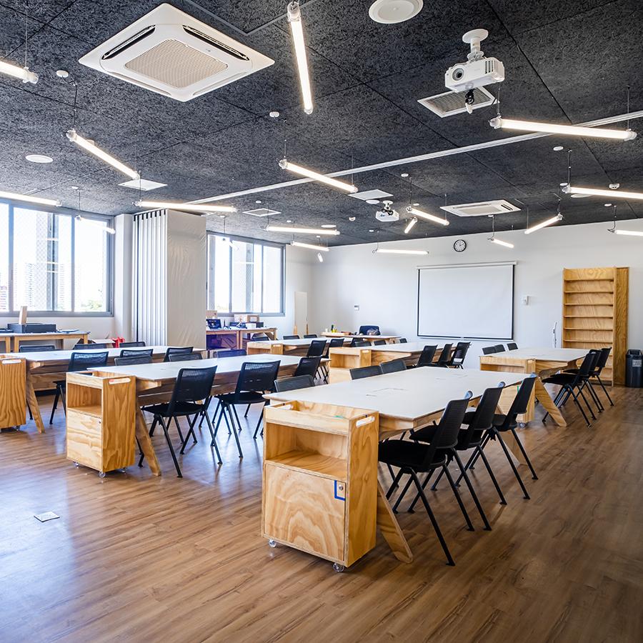 Designed by the architect Miguel Pinto Guimarães, the campus's newly-opened facilities include a Maker Space, a library, a multi-sport court, a court society, an open gymnasium, a Media Lab and an exclusive space dedicated to Early Childhood Education. In addition to unique rooms for drama, visual arts and music, students also have access to cutting-edge design technology facilities. The objective is to provide excellence in bilingual learning and to develop socio-emotional skills in line with the city's tradition.